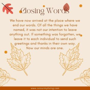 Gratitude and thanks is given, for the people, the earth, all of the creatures and plants that live among us and so often for us. That we are grateful and thankful for their contributions seems such a small price to pay for the value each brings to our lives. Thanks is also given to the elements and the greater Universe, all of which we are a part.