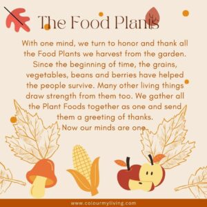 With one mind, we turn to honor and thank all the Food Plants we harvest from the garden who feed us with such abundance. Since the beginning of time, the grains, vegetables, beans and fruit have helped the people survive. Many other living beings draw strength from them as well. We gather together in our minds all the Plant Foods and send them our greetings and our thanks.